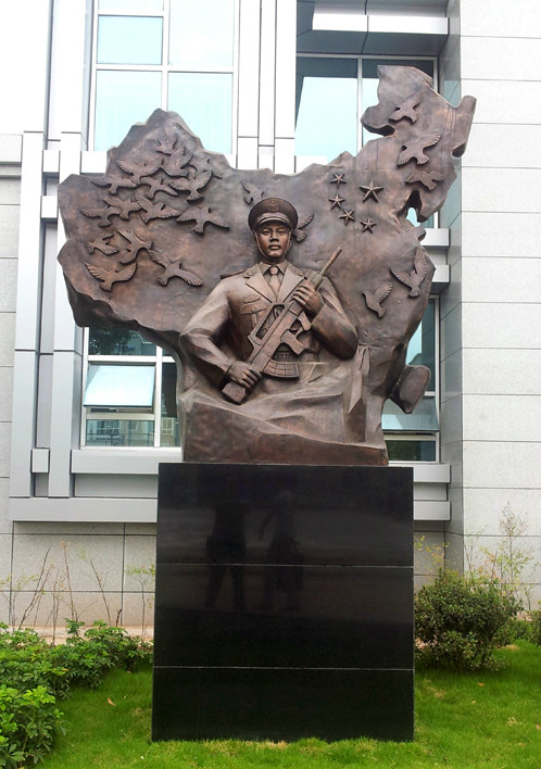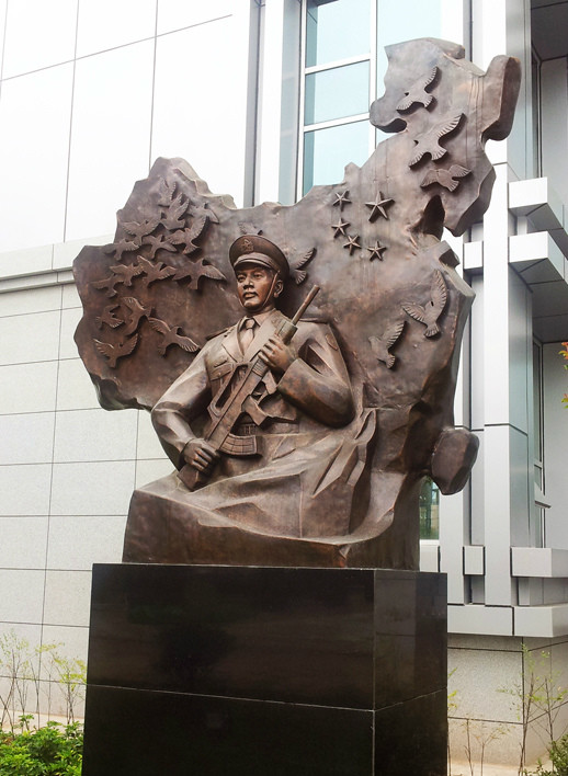 四川簡陽武裝部雕塑簡陽武裝部雕塑“為了祖國的安寧”落成于2012年。構思的時候我就想到魏巍那篇“誰是最可愛的人”的課文。當時就想通過雕塑展現出一個為了祖國站崗的“和平衛士”的形象出來!于是祖國地圖、和平鴿、手握鋼槍衛士相結合的形象就呼之欲出了,我所要做的就是把這三種元素進行合理而又巧妙的整合,讓他們融為一體,同時讓所有人能在第一眼看到雕塑時就聯想到“和平衛士”這一主題,在造型上還要具備強烈的視覺沖擊力。當方案出來后,部隊首長非常認同。 印象特別深刻的是在雕塑施工階段有軍人提出,能否將釣魚島和南沙群島體現上去;我們告訴他,我們雕塑體現的是大中國的概念,中國地圖的輪廓意向,已經包含了中國的每一寸領土,雕塑體現了當代軍人胸懷祖國、誓死捍衛祖國和平的象征!最終他們認同了我們的解釋。但從這個細節我感受到了他們的亮劍精神,感受到當代軍人“駕長車、踏破賀蘭山缺”豪邁與錚錚鐵骨!他們的血脈回響著“渴飲倭人血”和“不斬倭寇誓不還”的壯志雄心!所以我亦堅信:中日再有一戰,日本必敗 時逢當前的中國防空識別區確立的大手筆,大快人心;再想到這件雕塑的實施間軼事,有感而發,是為記。