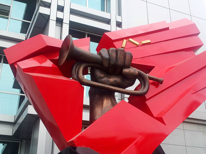 部隊雕塑“軍歌嘹亮” “軍歌嘹亮”是為簡陽武裝部設計制作的另一尊雕塑。構思時耳邊就回響著這樣一幅畫面:軍號已經吹響,軍旗迎風招展、獵獵作響,革命軍人冒著敵人的炮火在 陣陣軍歌聲中沖鋒陷陣、浴血奮戰!鑄成一道鋼鐵長城……在設計過程中,無關的元素一個個省略,經過了大膽的取舍,最后呈現出的就是一只有力的大手緊握軍號 從鏤空的軍旗五星中橫空出世的視覺形象!