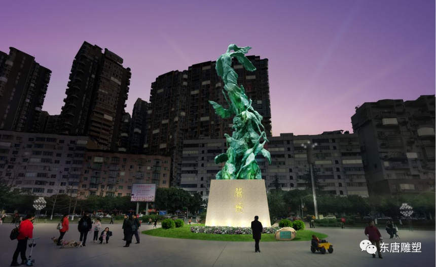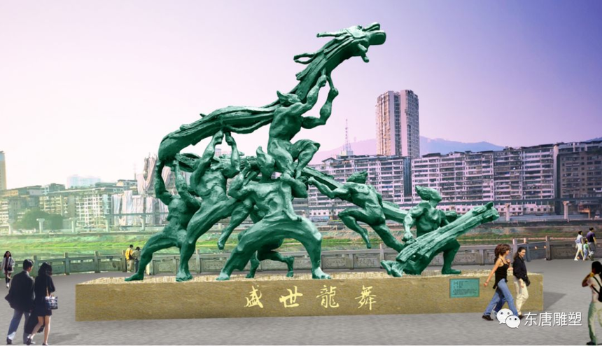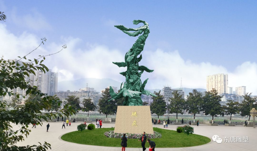 四川省達州市仙鶴廣場雕塑項目落成該項目由藝術大師侯一民先生、北京中國書畫協會會長焦廣勝先生、東唐雕塑藝術總監朱勇先生擔綱項目主創設計, 內容包含仙鶴廣場主題鑄銅雕塑《騰飛》(雕塑高13.8米,不含底座)與《盛世龍舞》(雕塑高6.5米,不含底座)兩組雕塑。