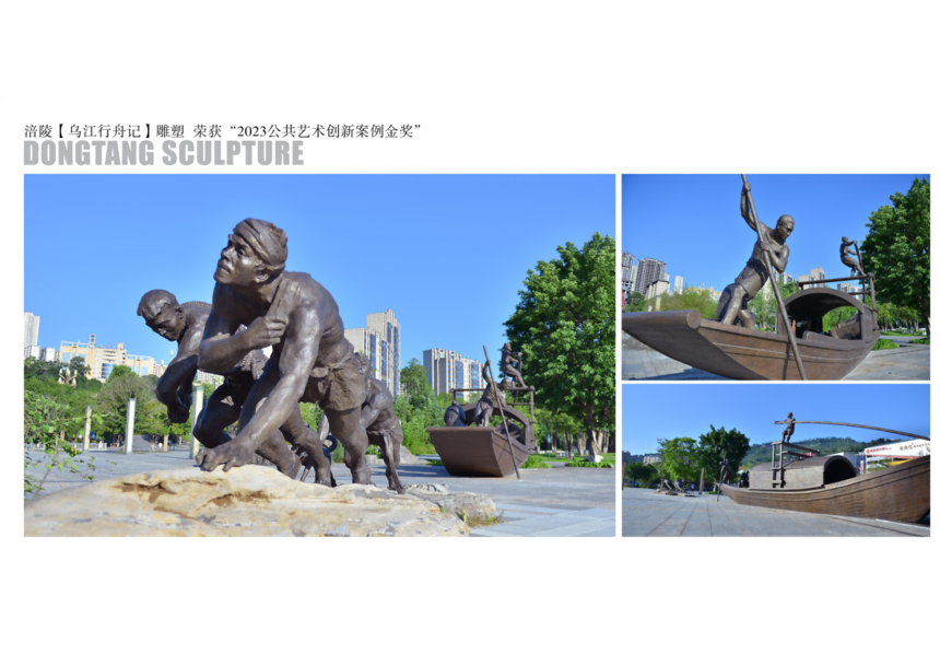 以曾經(jīng)來往于烏江上下游的一種特殊造型的翹舳櫓舟(俗稱“歪屁股船”)為主要元素,加上烏江纖夫拉船的情景, 制作了“烏江行舟記”這一組雕塑,反映了烏江流域先民不畏艱險、積極進取、樂觀向上的精神追求, 以喚起烏江兩岸人們記憶中的鄉(xiāng)愁、激發(fā)人們?yōu)槊篮蒙疃鴬^斗的信心;